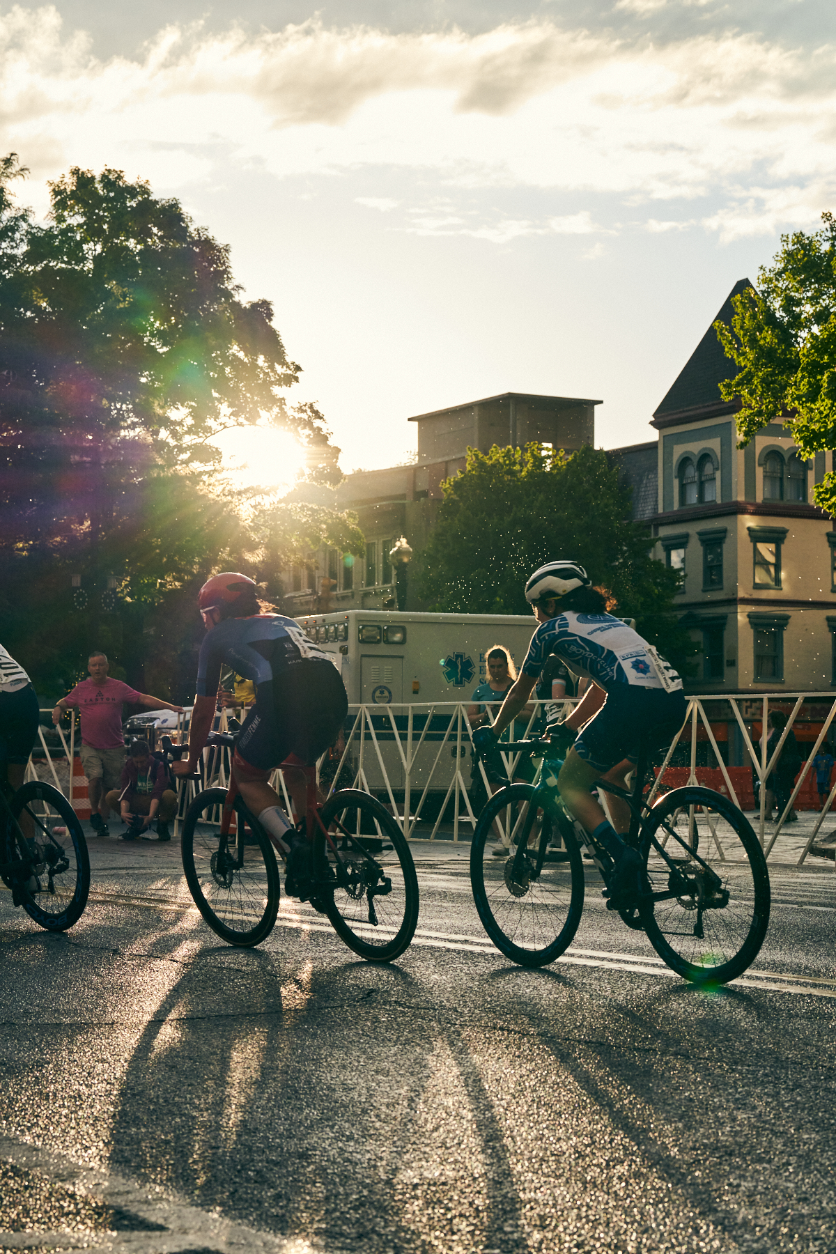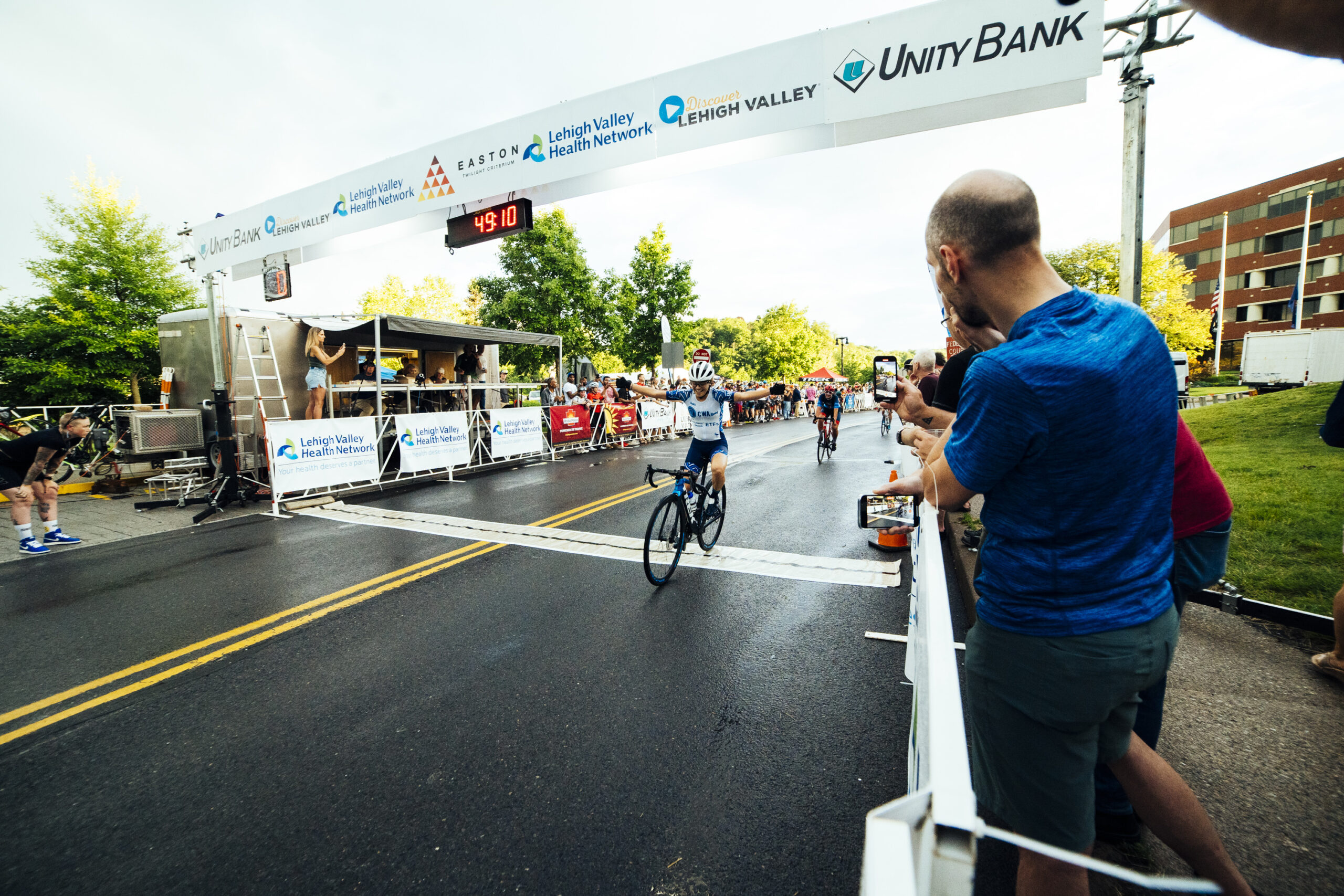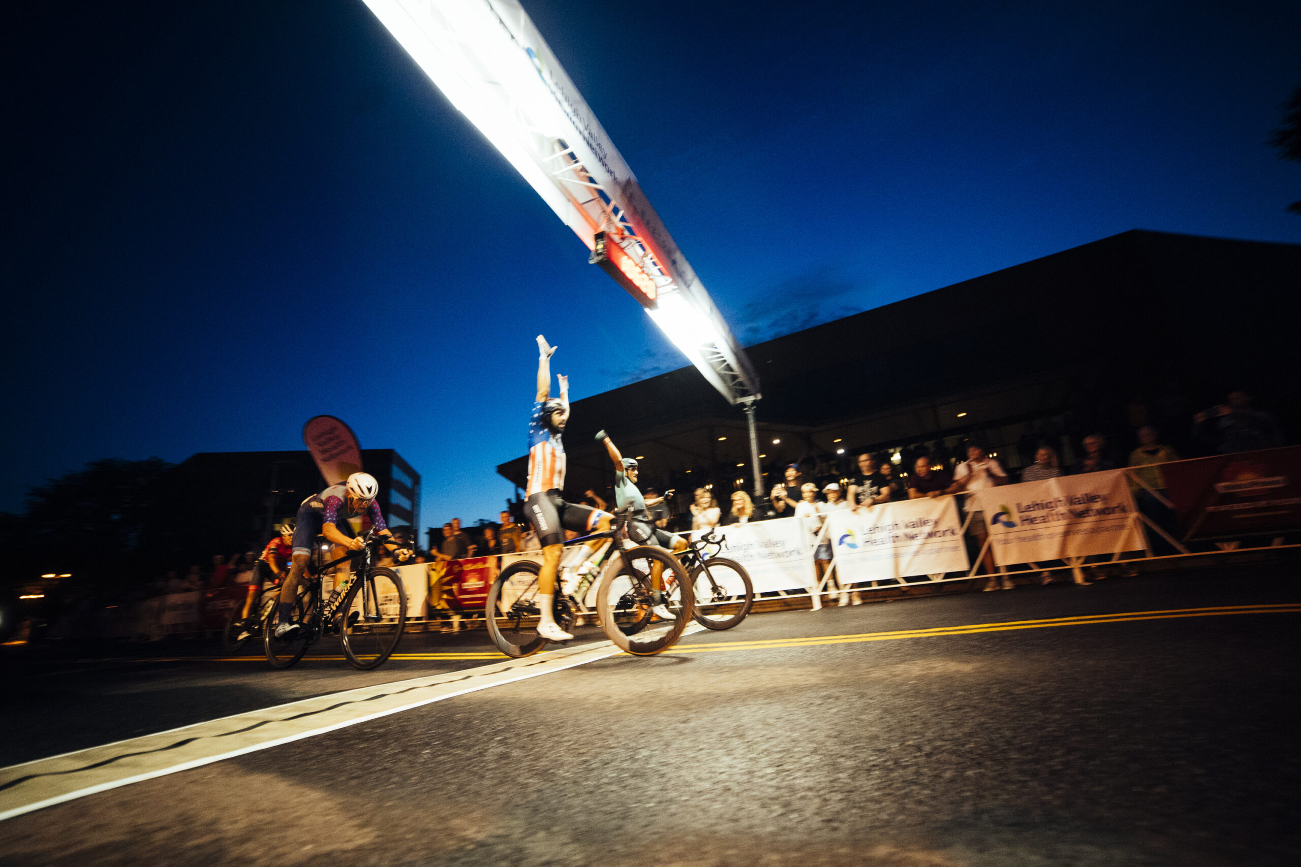 2022 Easton Twilight Crit pb Lehigh Valley Health Network kicked off Memorial Day weekend in the Mid-Atlantic on Saturday, May 28, 2022. The day saw intermittent rain showers that gave way to a double rainbow for the Pro Women’s race, which Spaniard Katia Martinez of CWA Racing won. CWA was aggressive the entire race, putting riders up the road multiple times, including Marjorie Bemis and Jessica Bonilla. But a late reshuffling of the front was caused by Australian Lisa Jacob of Fearless Femme Racing, bringing out eventual race winner Martinez and Bemis. From the field, Bethany Matsick of BikeWorks PA pb Fred Beans Dealership bridged across with three laps remaining, causing a surge in the field from Colleen Gulick of Team Skyline and Emily Flynn of LA Sweat. But the final separation of Jacob, Martinez, Bemis, and Matsick had enough of a gap to carry their advantage to the line just ahead of the field. Bemis led out the final lap, and Martinez was able to use her BMX sprint to outkick Jacob and Matsick for the win.